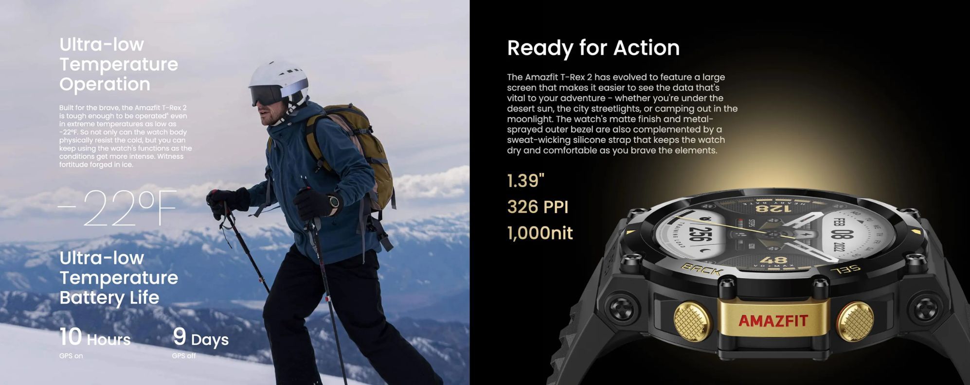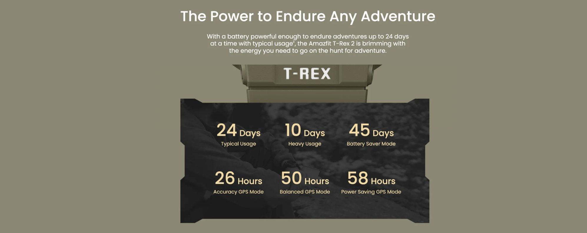With a battery powerful enough to endure adventures up to 24 days at a time with typical usage, the Amazfit T-Rex 2 is brimming with the energy you need to go on the hunt for adventure. - Ultra-low Temperature Operation