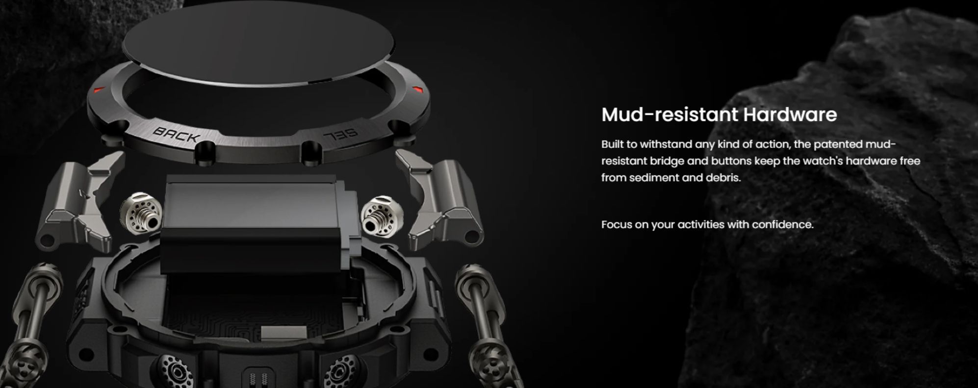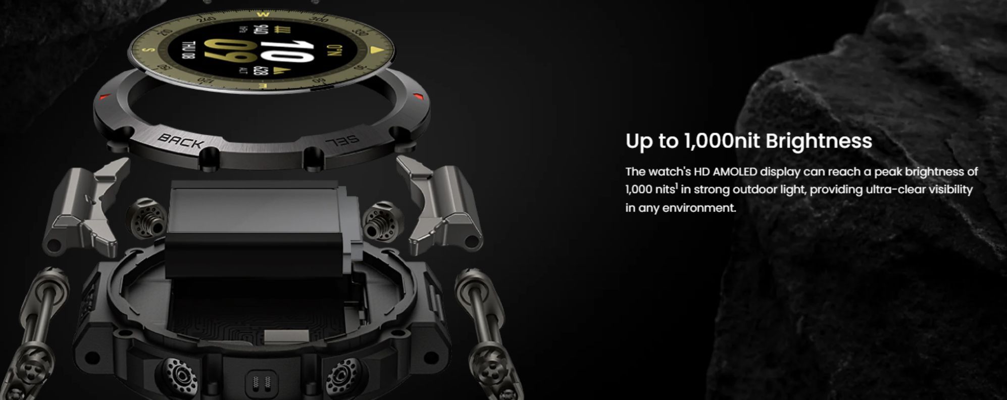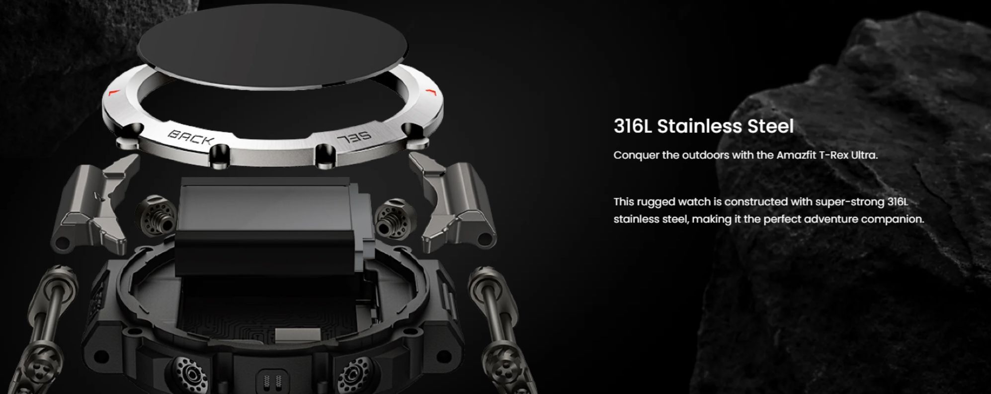 Constructed with super-strong 316L stainless steel and a patented mud-resistant bridge and buttons, Amazfit T-Rex Ultra is built to withstand any kind of action. The smartwatch's HD AMOLED display can reach a peak brightness of 1,000 nits for ultra-clear visibility in any environment. Adjustable lugs ensure maximum comfort for the entirety of your epic adventures, and you can enjoy ultimate control with a responsive touchscreen and four convenient buttons. - 30m Freediving Support