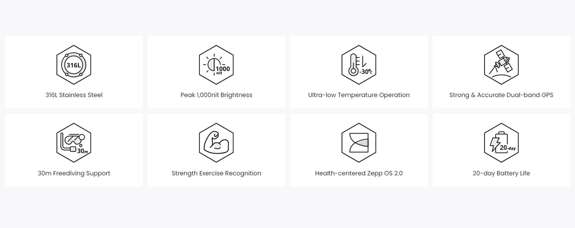 Built for the brave, the watch is tough enough to be operated in extreme temperatures as low as -30℃, thanks to its specially designed circuitry system and battery. So not only can the watch body physically resist the cold, but you can keep using the watch's functions as the conditions get more intense. - Health-centered Zepp OS 2.0