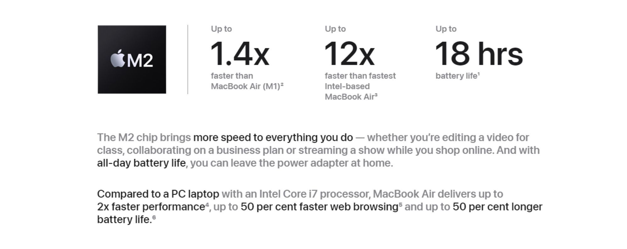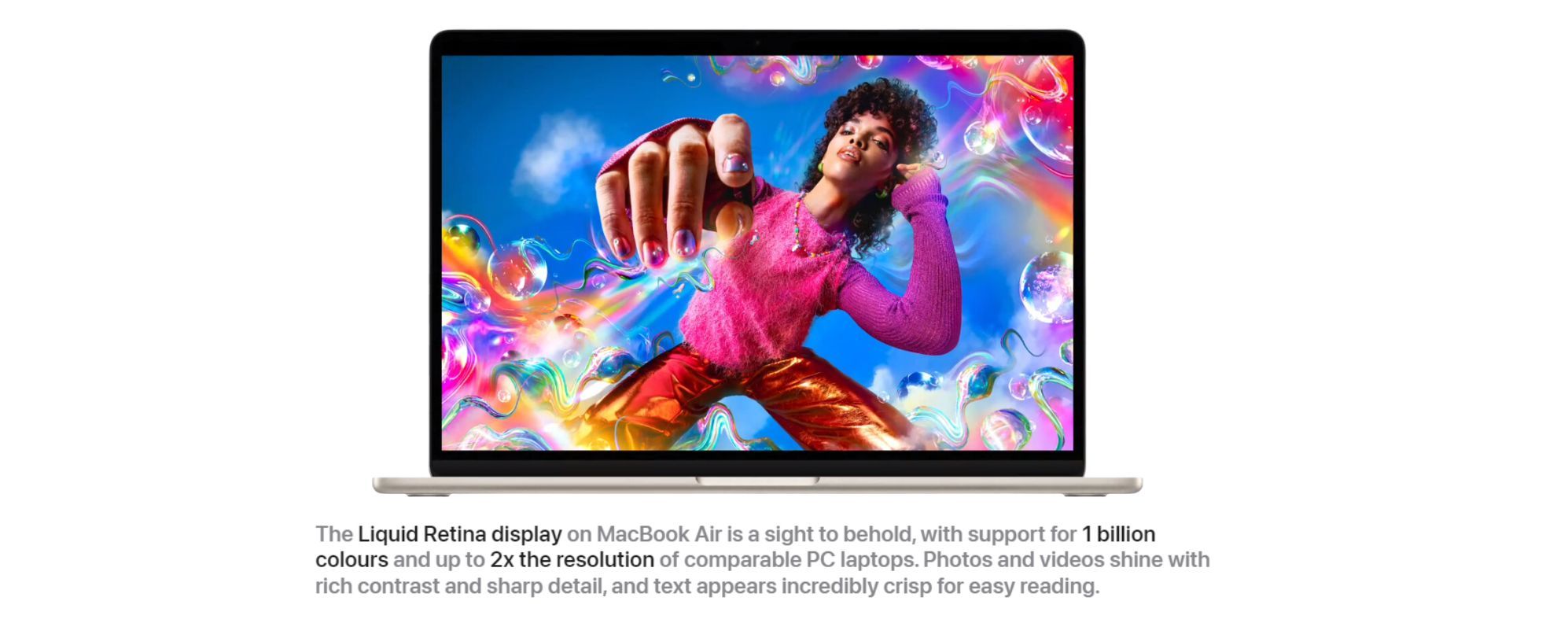The Liquid Retina display on MacBook Air is a sight to behold, with support for 1 billion colours and up to 2x the resolution of comparable PC laptops. Photos and videos shine with rich contrast and sharp detail, and text appears incredibly crisp for easy reading. - Just your type