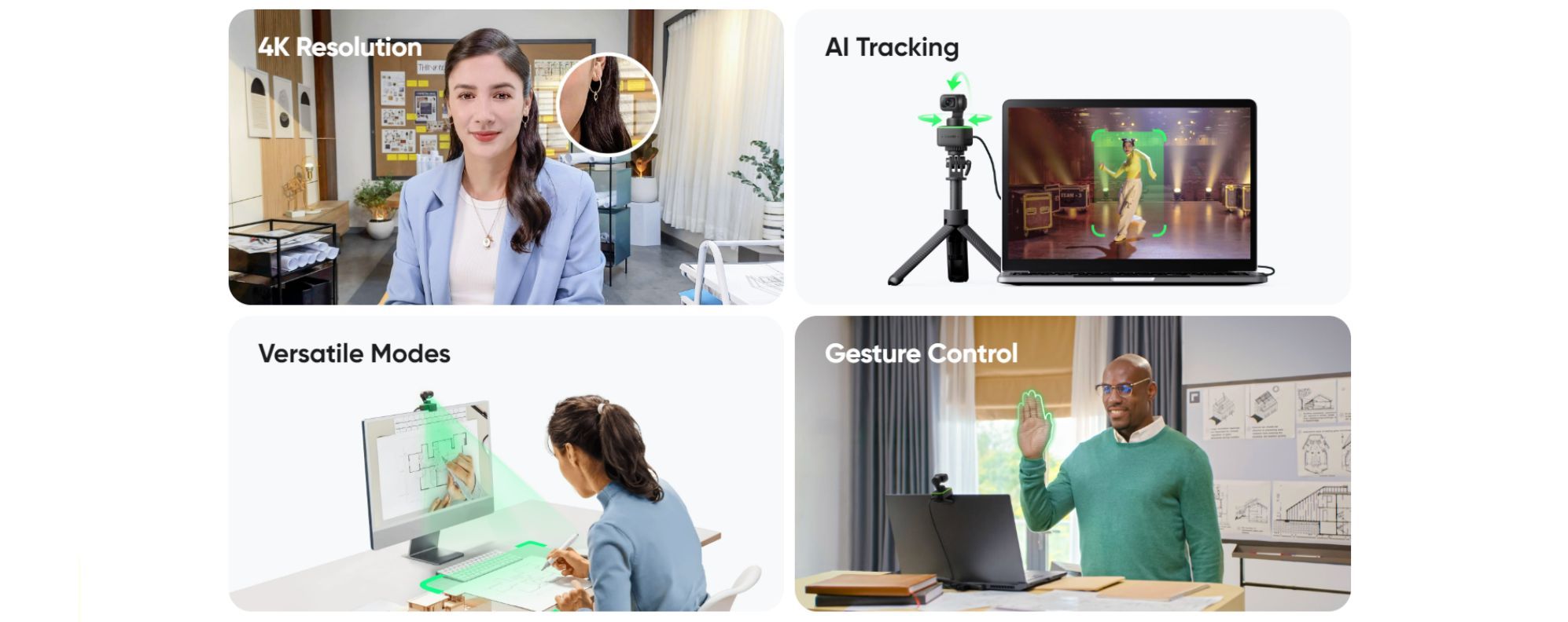 The Insta360 Link’s versatility and different modes make it an ideal webcam for us in a number of different environments, such as in a professional business conference call, a classroom or education setting or finally simply use it to enhance your live streaming. Simply connect the Link to your computer via a USB cable and attached the camera to your monitor thanks to a handy mountable clip and explore the enhanced capabilities of the Insta360 4k webcam. - Four Enhanced modes
