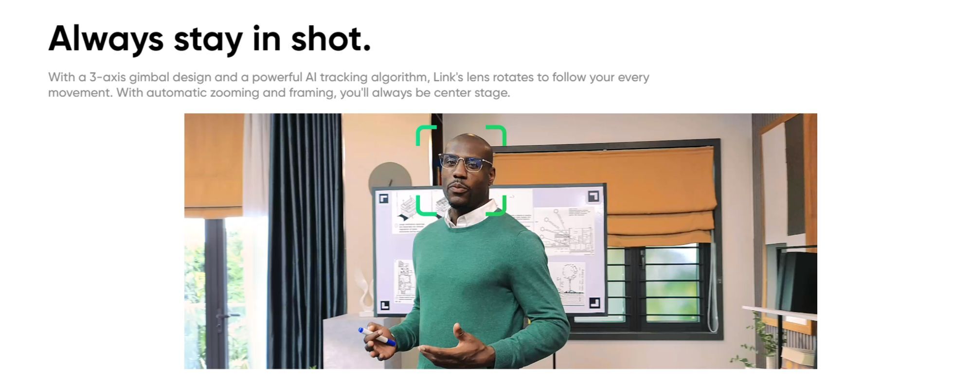 Built with four modes including Whiteboard, Portrait, DeskView and Overhead mode. The Insta360 Link can be switched between them to provide you with your ideal webcam experience. - Whiteboard Mode