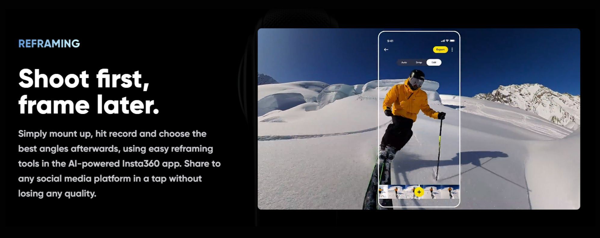 The magic of 360 capture is the ability to choose the best angle after the fact. Easy AI-powered reframing tools in the Insta360 app make it easy to find the perfect, so you’ll never miss a shot again. - 72MP 360° Photo