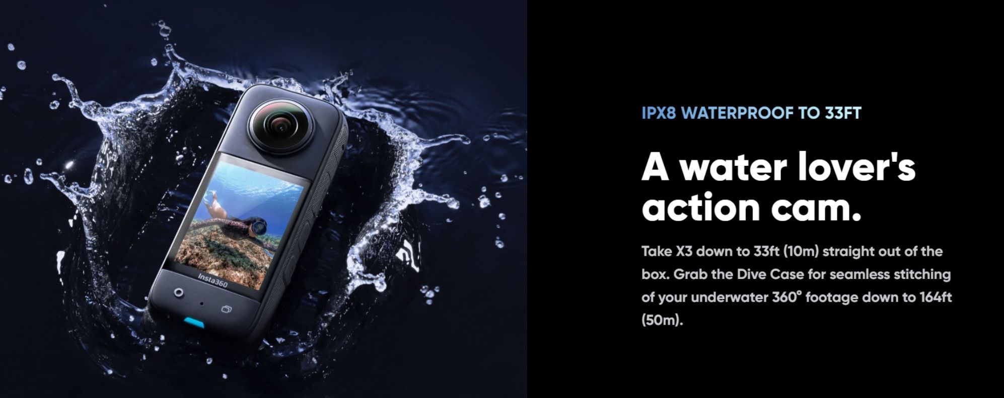 Rugged and IPX8 waterproof to 33ft (10m) straight out of the box. Grab the Dive Case for seamless stitching of your underwater 360 footage down to 164ft (50m). - Bigger, Better Battery